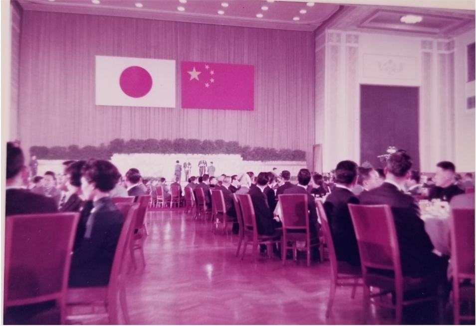 日方一行入住钓鱼台国宾馆时,我们 MT 办事处的代表和随员也过去帮忙。”9 月 28日晚上,在人民大会堂为田中角荣一行举办了答礼宴会,大久保与冈崎嘉平太一同出席。宴会上周总理的发言,大久保至今仍然清晰地记得。