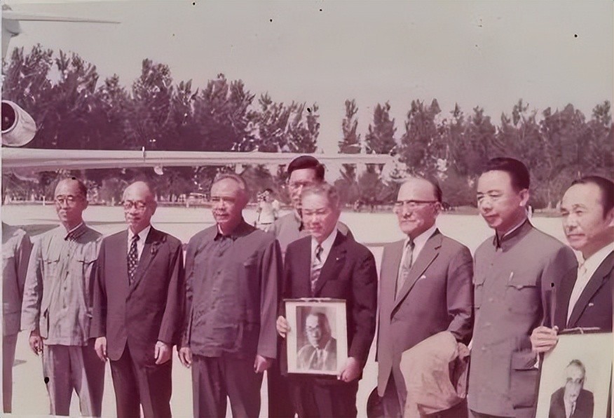 1972 年 9 月从东京直达北京的航班访中的古井、 田川等自民党议员(手举照片为已经去世的松村谦三、高碕达之助)