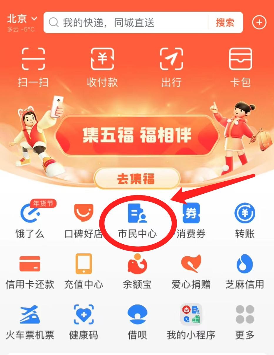 首先,打开支付宝,在支付宝首页,能看到一个叫做“市民中心”的入口。