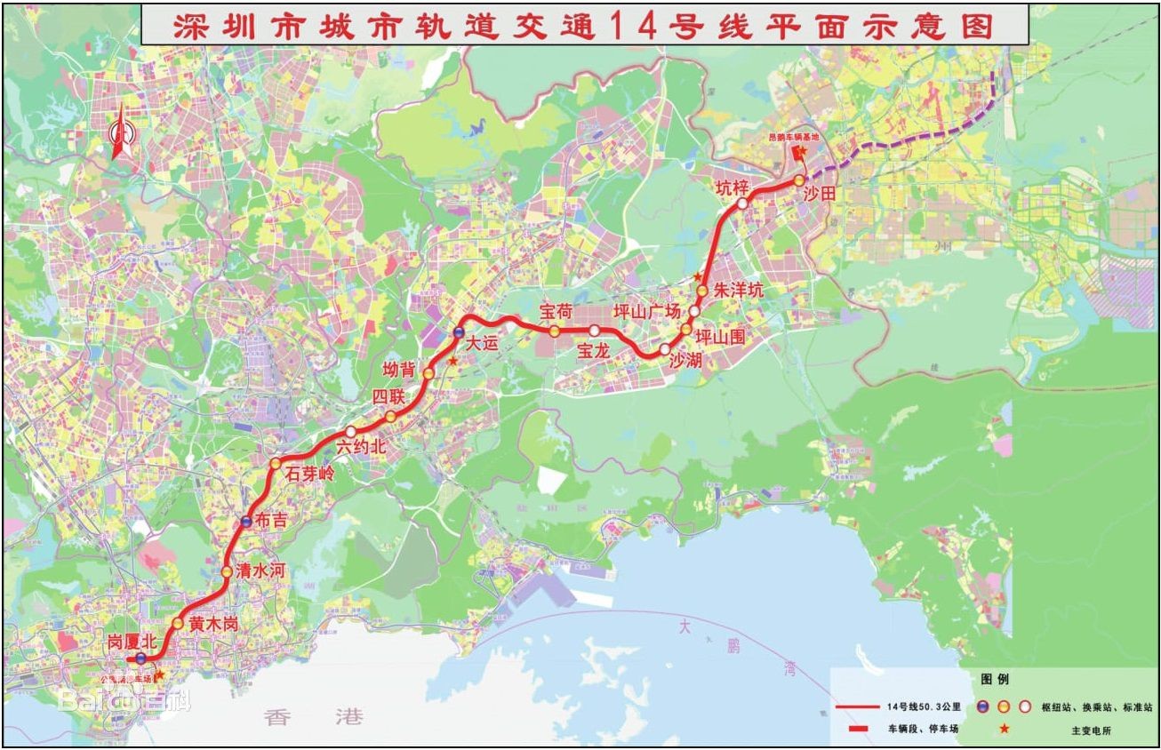 深圳地铁14号线起自福田中心区岗厦北枢纽,止于坪山区沙田站,途经罗湖区和龙岗区,
