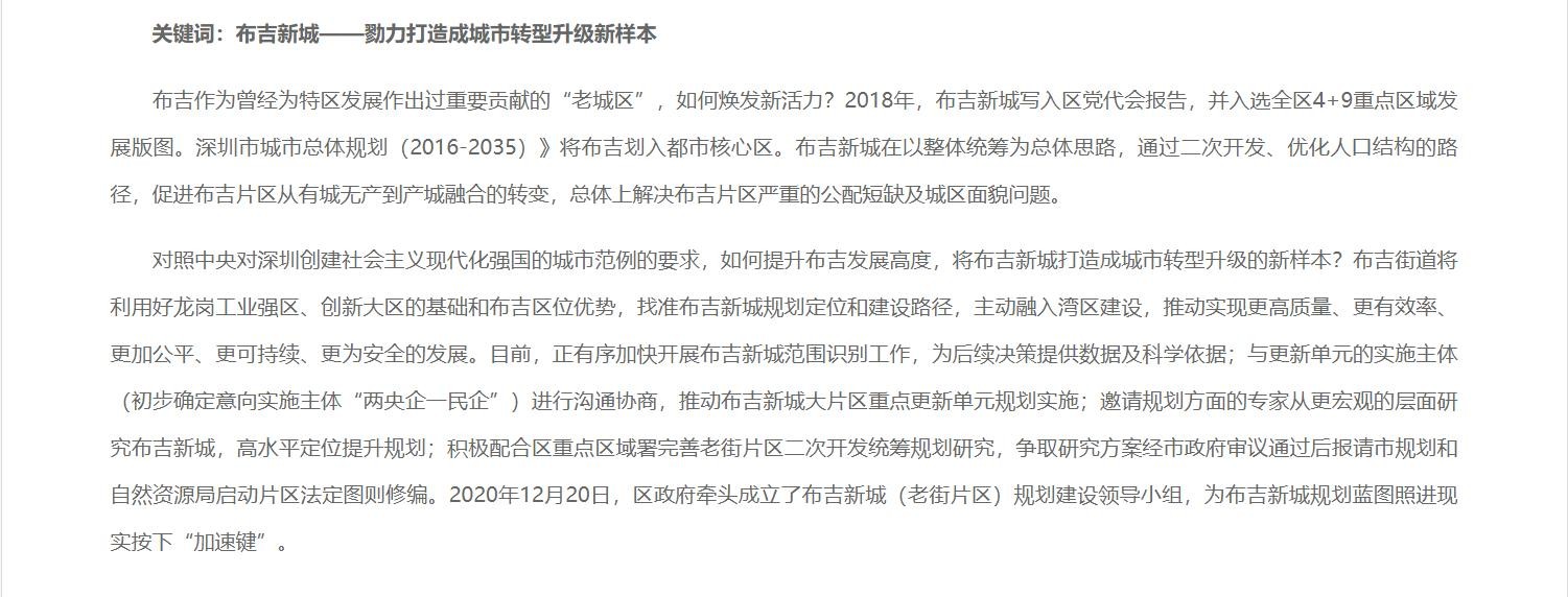 目前布吉正在大力推动城市更新,旧改项目遍地开花,其中布吉-水径片区、三联片区、南门墩片区、木棉湾片区,金稻田片区、布吉老街片区等几个城市更新大项目是其中的重点改造项目。