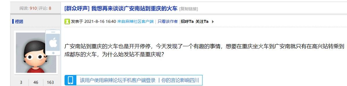 8月16日,有网友在麻辣社区广安论坛发帖,反映关于广安南站到重庆站的直达列车停开的问题。