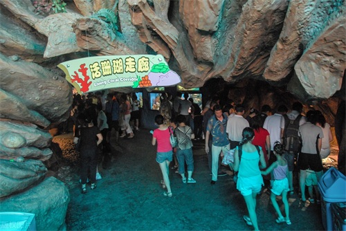 极地馆对面是珊瑚馆,珊瑚馆展示的是活体珊瑚和热带鱼,是亚洲最大展示珊瑚礁生物群为主的海洋生物馆,为一条通道的形式,走进珊瑚馆就像走进一个五彩缤纷的万花筒和传说中的童话世界。珊瑚馆是没有表演的,游览时间大约在30-40分钟,您可以根据表演时间选择参观顺序。