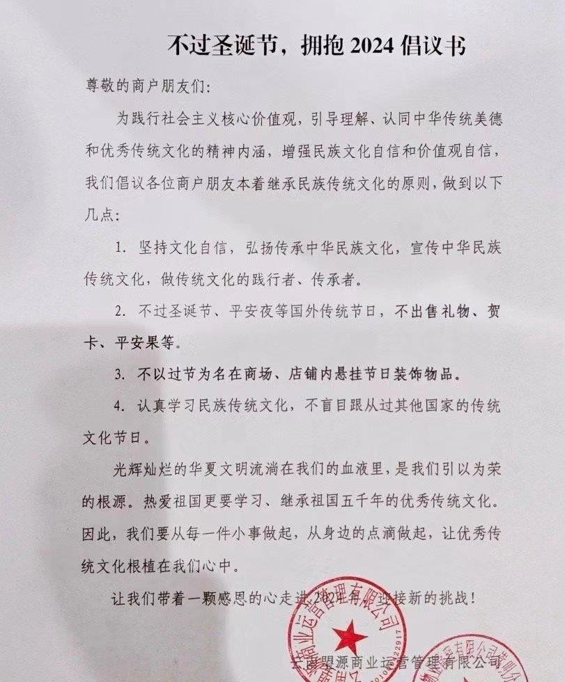 最近,深圳一家物业公司提出了一个引发广泛讨论的倡议:不过圣诞节,拥抱2024。该倡议书鼓励人们坚持文化自信,不庆祝外国的传统节日,并强调了学习和继承民族传统文化的重要性。这份倡议书迅速引起了公众对于文化自信与全球化背景下的文化交流之间关系的反思。