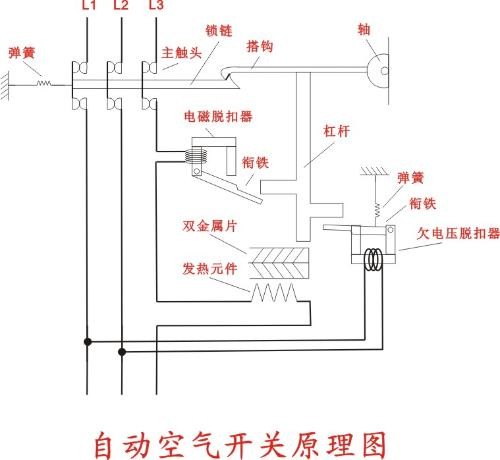 空气开关也成为空气断路器。其原理就是以空气作为绝缘介质,在电路中接通电流,使元件产生热量,促使里面的双金属片受到热量之后向上弯曲,推动杠杆,使锁住的锁扣打开,切断电源,从而空气开关就会自己自动跳闸,达到一个保护电流的作用。一般自动跳闸的情况,都是因为电路承载过重,或者短路等问题。而锁扣的打开就是采用杠杆装置,杠杆的推动可以让锁扣开启,达到自动跳闸的目的。