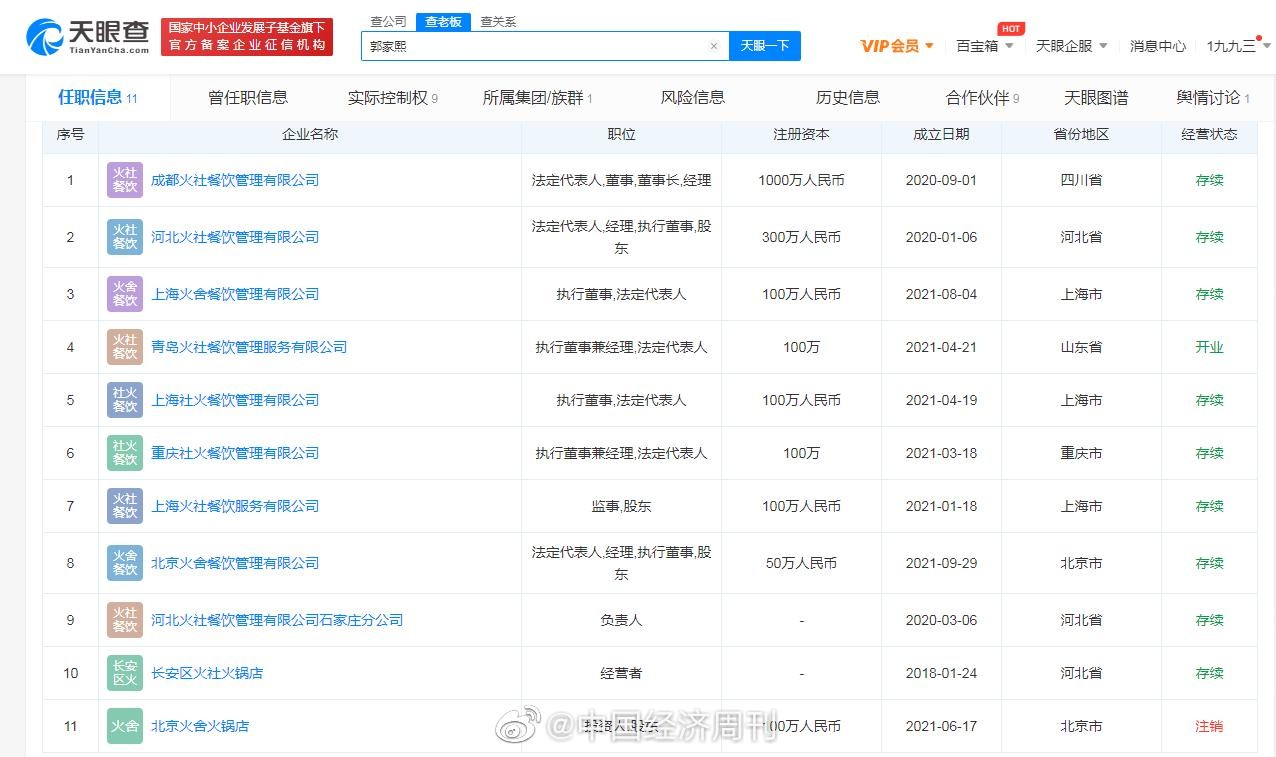 此外,邓伦此前还和发小们共同创立了火锅品牌“火社火锅”。天眼查App显示,河北火社餐饮管理有限公司成立于2020年1月,法定代表人及执行董事、经理均为郭家熙。不久,该公司投资成立成都火社餐饮管理有限公司。随后,成都火社公司又投资成立重庆社火、上海社火、青岛火社、上海火舍几家公司。2021年9月,同样由郭家熙担任法定代表人的北京火舍餐饮管理有限公司成立。上述火社火锅关联公司和邓伦并无直接关联。