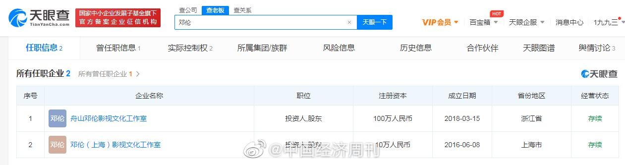 在邓伦因偷税漏税被罚成为网络热搜的同时,邓伦个人资本版图也浮出水面。据天眼查App信息显示,目前邓伦名下有2家公司,分别为邓伦(上海)影视文化工作室和舟山邓伦影视文化工作室,2家工作室均为邓伦个人独资企业,分别成立于2016年和2018年。