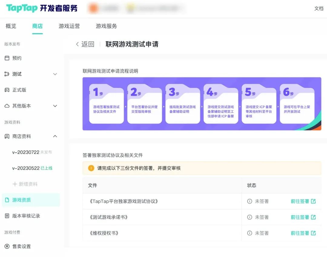 如有意愿申请《测试游戏备案辅助证明》,游戏开发者乐意在「开发者后台 - 工单 - 监管政策要求及咨询 - 移动互联网应用程序备案工作」位置提交申请,TapTap将在1个工作日内开通申请入口。待线上签署完成后提交审核,平台将对协议内容进行审核并在每个月15号左右向监管单位提交审批名单。待监管单位审批通过后,TapTap将通过站内信形式发放《测试游戏备案辅助证明》。