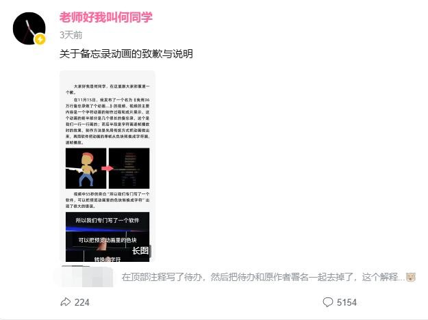 何同学因抄袭事件致歉。19日下午,UP主“老师好我叫何同学”在视频《我用 36 万行备忘录做了个动画…》的评论区致歉并且回应了抄袭质疑,承认了这款软件确实是“从开源程序改动而来”,但在与其他同事协作时出现纰漏,导致相关文案和旁白出现问题。21日下午,何同学再次发布了《关于备忘录动画的致歉与说明》进一步道歉,并表示已经联系到了软件的原作者VietNguyen,向VietNguyen表示了歉意。