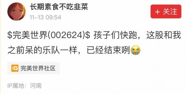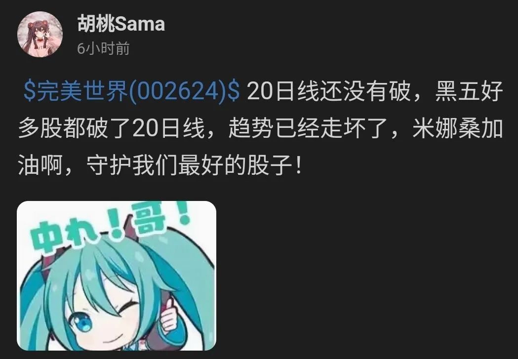 至于为什么“中招”的是完美世界,其实找不到源头了。有个说法是,国内头部的二游公司,要么没上市要么在海外上市买不到,而完美世界旗下,有老的《幻塔》《P5X》新的《异环》,算是二次元浓度比较高的,在零星几个人开始玩梗后,就一发不可收拾了。