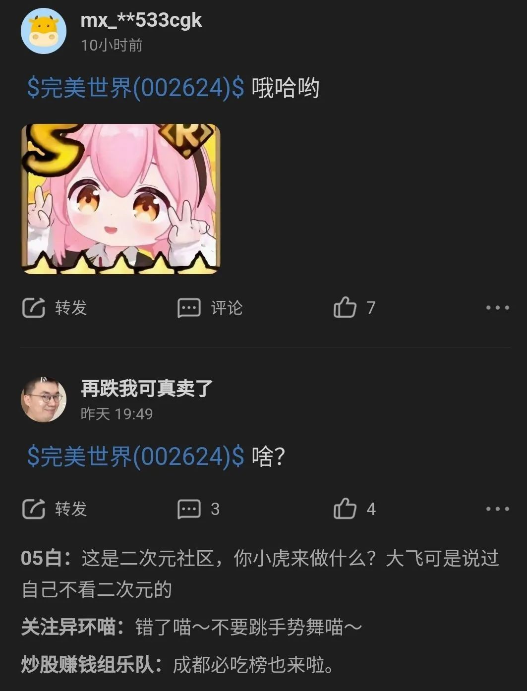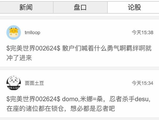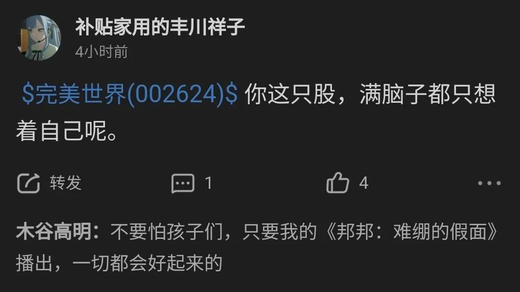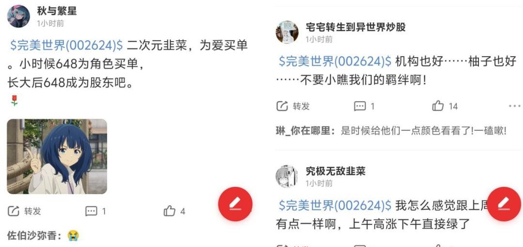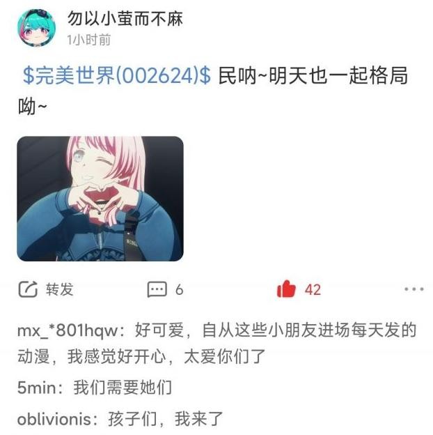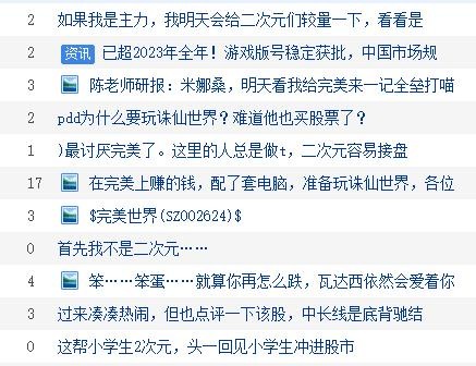 而且这事也带着较浓的营销意味,一些老ass就指出可能是有人想炒作完美世界的股价。说白了,个股的讨论区平时热度并不高,股民也不会真的来这里发干货,主要的功能就是发泄、炫耀、抱团取暖。因此,哪怕只是个二次元群组织整活,也能轻松“占领”评论区,股票是不买的,串子是要当的。