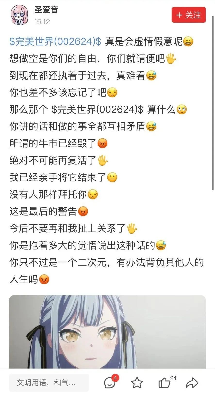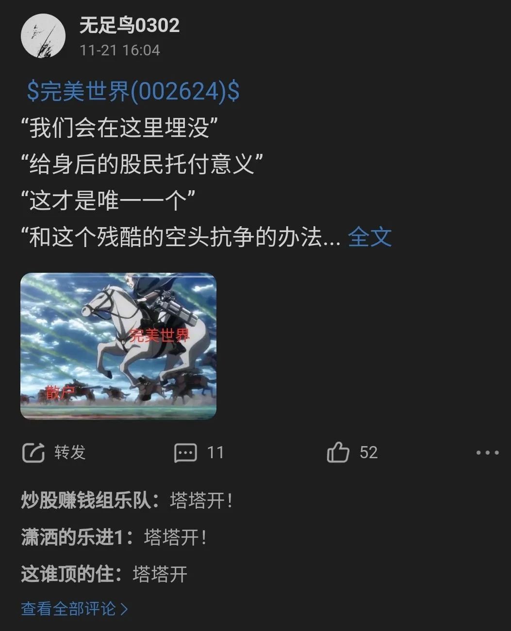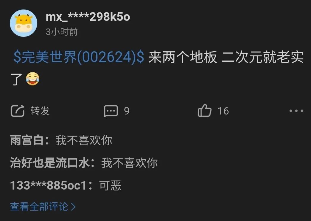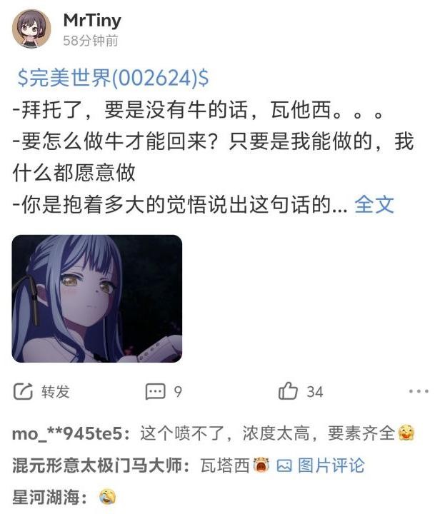 而且这事也带着较浓的营销意味,一些老ass就指出可能是有人想炒作完美世界的股价。说白了,个股的讨论区平时热度并不高,股民也不会真的来这里发干货,主要的功能就是发泄、炫耀、抱团取暖。因此,哪怕只是个二次元群组织整活,也能轻松“占领”评论区,股票是不买的,串子是要当的。