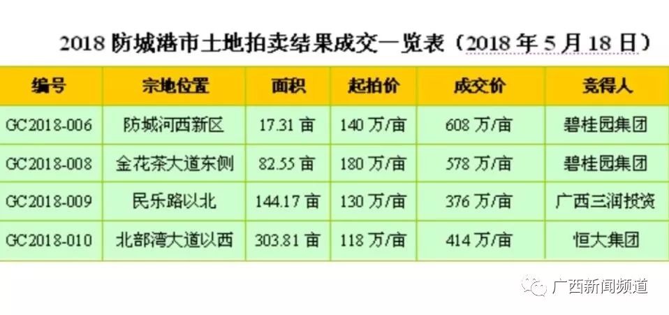 5月18日,防城港市推出四宗土地拍卖,吸引了众多知名房企,竞争异常激烈。其中防城区一重点学区地块成交单价为608万/亩、溢价率334%,刷新了防城港有史以来土地拍卖单价最高成交纪录,成为新地王。港口区北部湾大道一地块,成交楼面价3220元/平方米,同样创下新高。