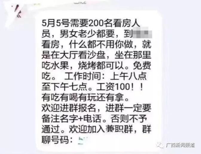 在采访中,一名房产从业人员透露,5月防城港楼市的“疯狂”从一开始就感觉有人在造势。他向记者出示了5月初在微信朋友圈广泛流传的一则"招人"信息,某楼盘开盘前以每人每天100元的价格,征集200人去售楼部“免费吃喝”,目的就是通过这些“托儿”营造开盘抢房的火爆景象。在各种复杂因素的推动和影响下,防城港房价在短短一个多月内迅速上涨,让很多人震惊和不安。