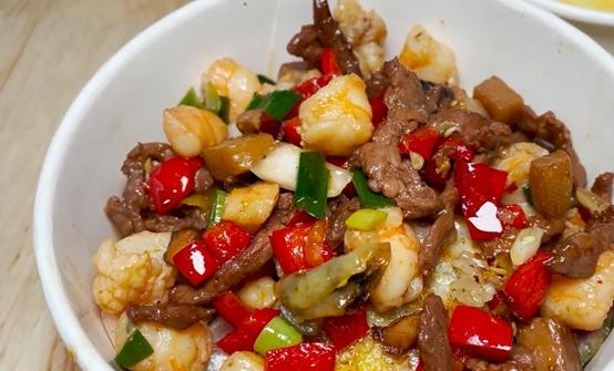 57元的全家福套餐里面配料非常的丰富,有牛肉,肉丝,腰花,还有鳝鱼和虾仁,是一套五合一组合,这57的天价豆皮套餐一天也会卖出去几十份,这生意也算可以了。