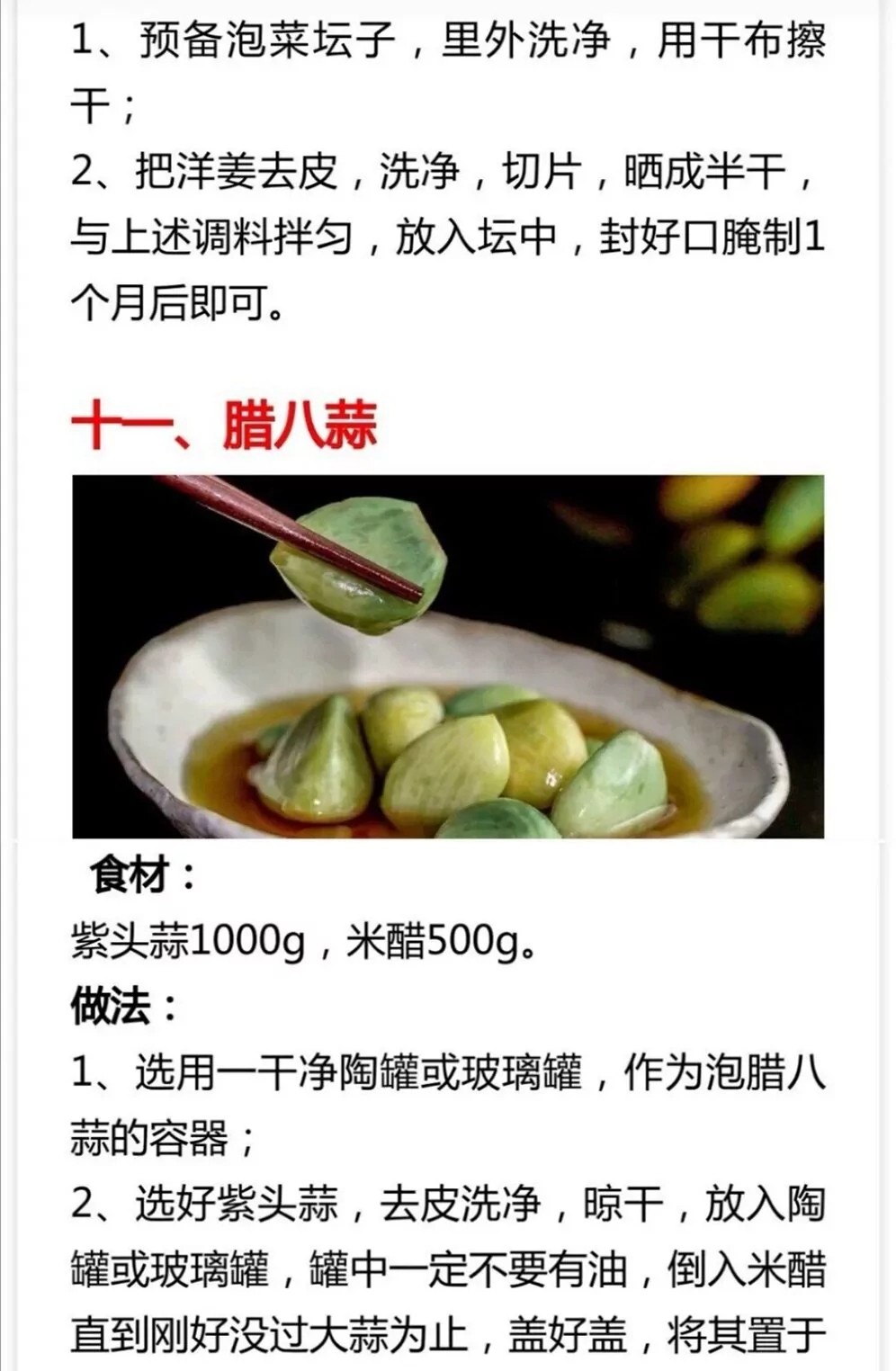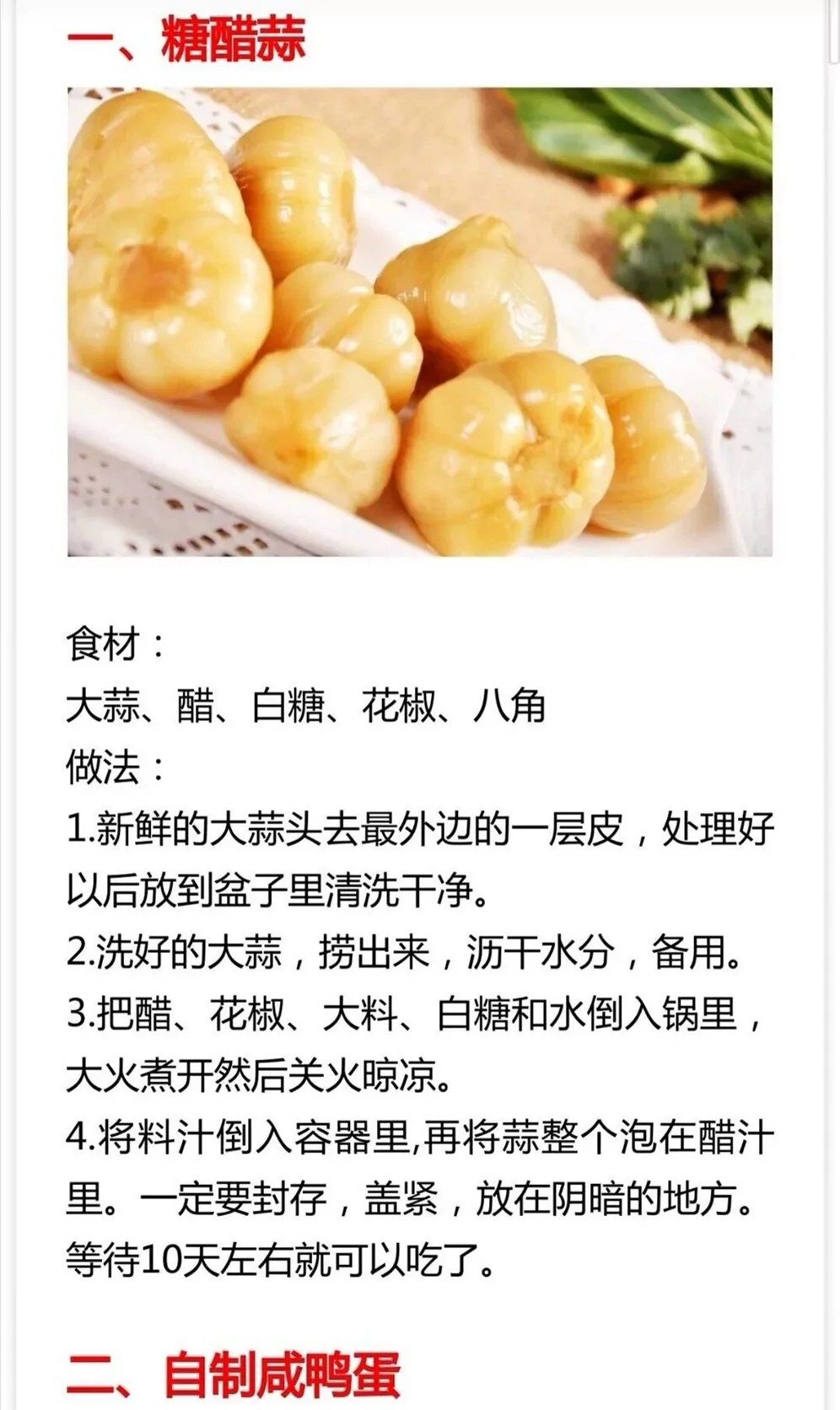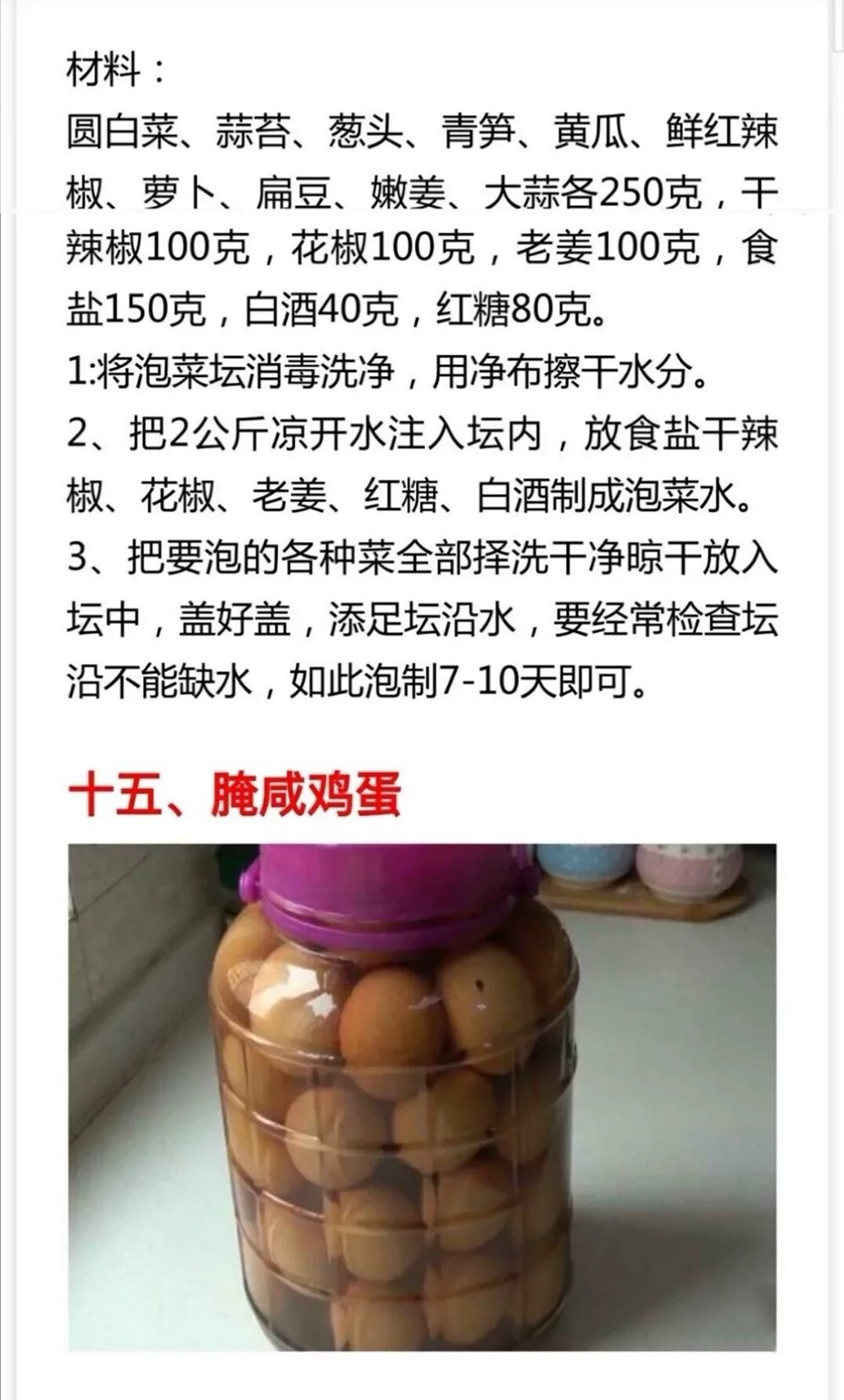 下面是糖醋蒜、自制咸鸭蛋、腌辣椒、腌辣白菜、四川泡菜、黄瓜咸菜、