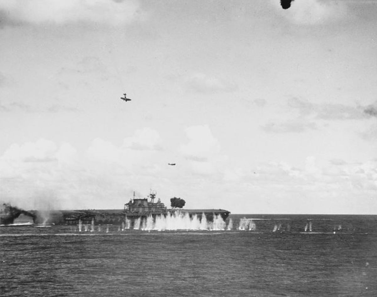 遭到攻击的大黄蜂号,平飞的应该是完成攻击的舰攻,正在俯冲的是舰爆