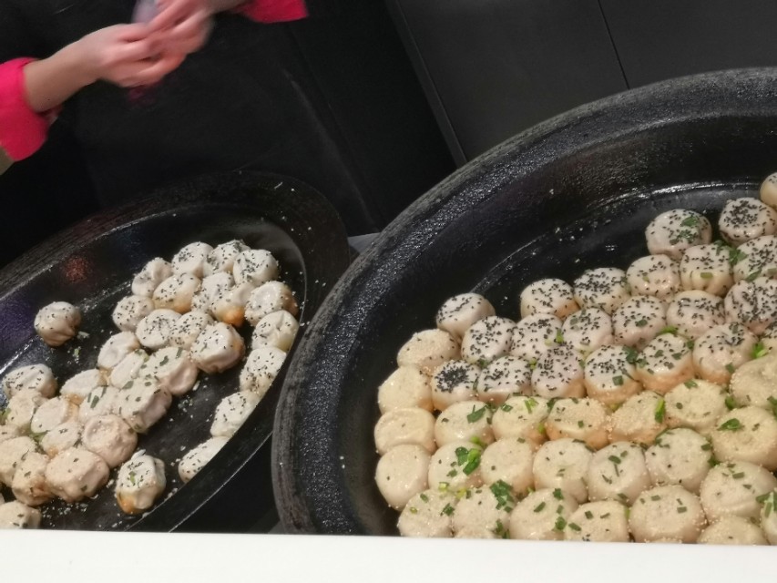 这家店面不大,一前一后以透明玻璃间隔,隔着玻璃能看到后台正手工制作包子,一个一个放在超大的平底锅内。上撒芝麻和葱花。