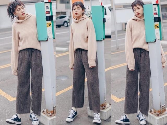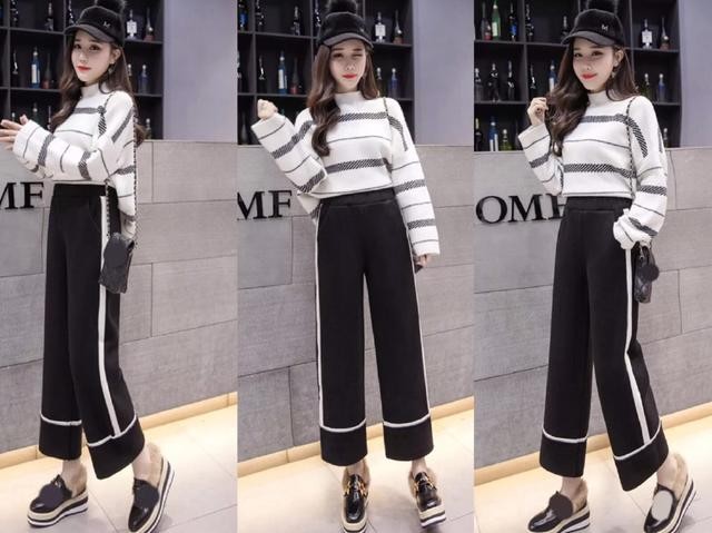 白色毛衣,很提亮肤色。宽松版型,遮盖胳膊的肉肉。搭配黑色条纹阔腿裤,上衣内扎进裤子里。很优化腿部线条。宽松的裤腿里隐藏一两件保暖单品,不臃肿,又保暖。