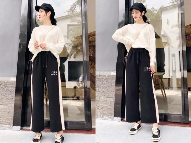 黑色很显瘦。裤子白色点缀,更显时尚感。搭配一件条纹的毛衣很简单又时髦,搭配帽子,凹造型又显个。整体休闲又时尚。