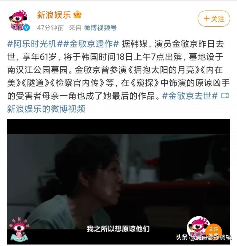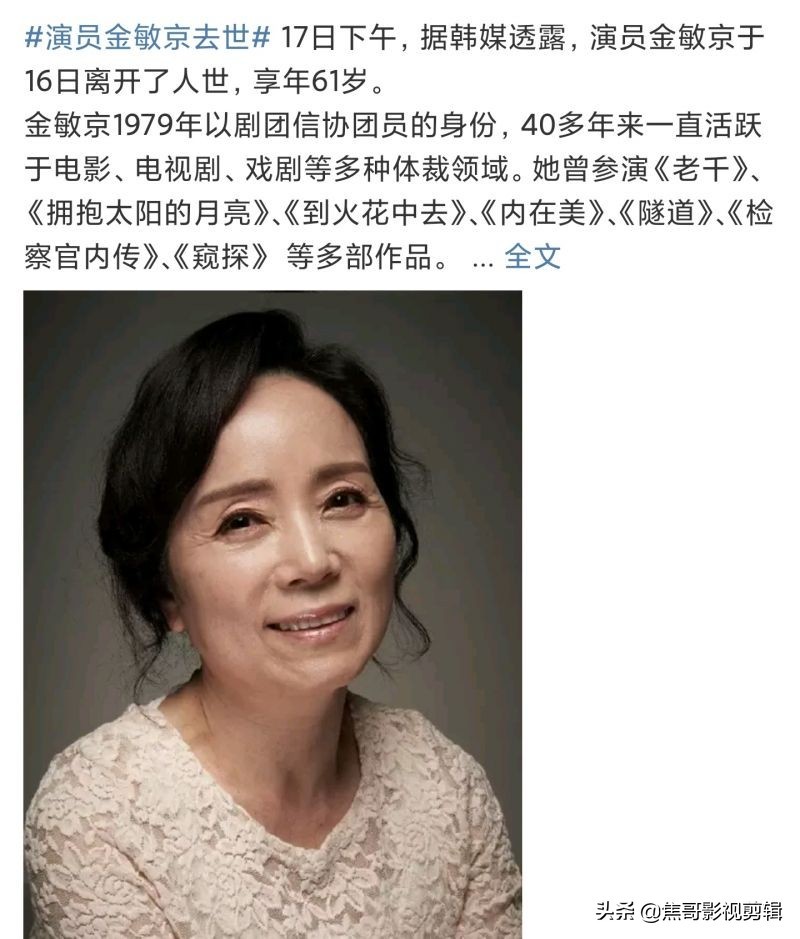 8月17日下午,韩国娱乐圈传来噩耗,据韩媒透露,演员金敏京于16日离开了人世,享年61岁。据悉金敏京1979年以剧团信协团员的身份,40多年来一直活跃于电影、电视剧、戏剧等多种体裁领域。她曾参演《老千》、《拥抱太阳的月亮》、《到火花中去》、《内在美》、《隧道》、《检察官内传》、《窥探》 等多部作品。据韩媒,演员金敏京昨日去世,享年61岁,将于韩国时间18日上午7点出殡,墓地设于南汉江公园墓园。金敏京在《窥探》中饰演的原谅凶手的受害者母亲一角也成了她最后的作品。