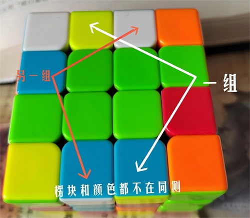 2.两组互逆楞块:①楞块和颜色不在同一侧:用——下下逆下下(FR'D'F2)转为同侧同颜色。