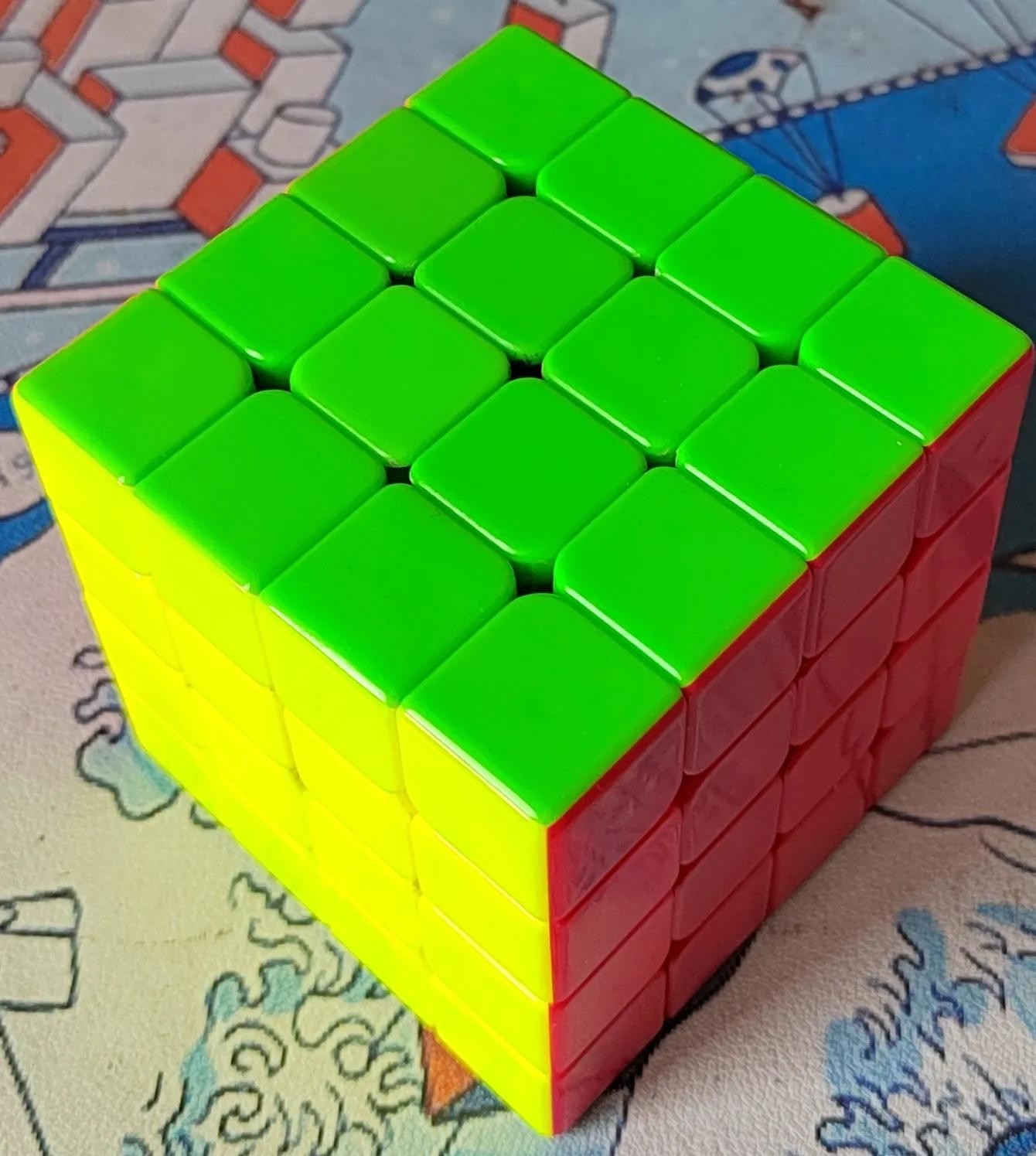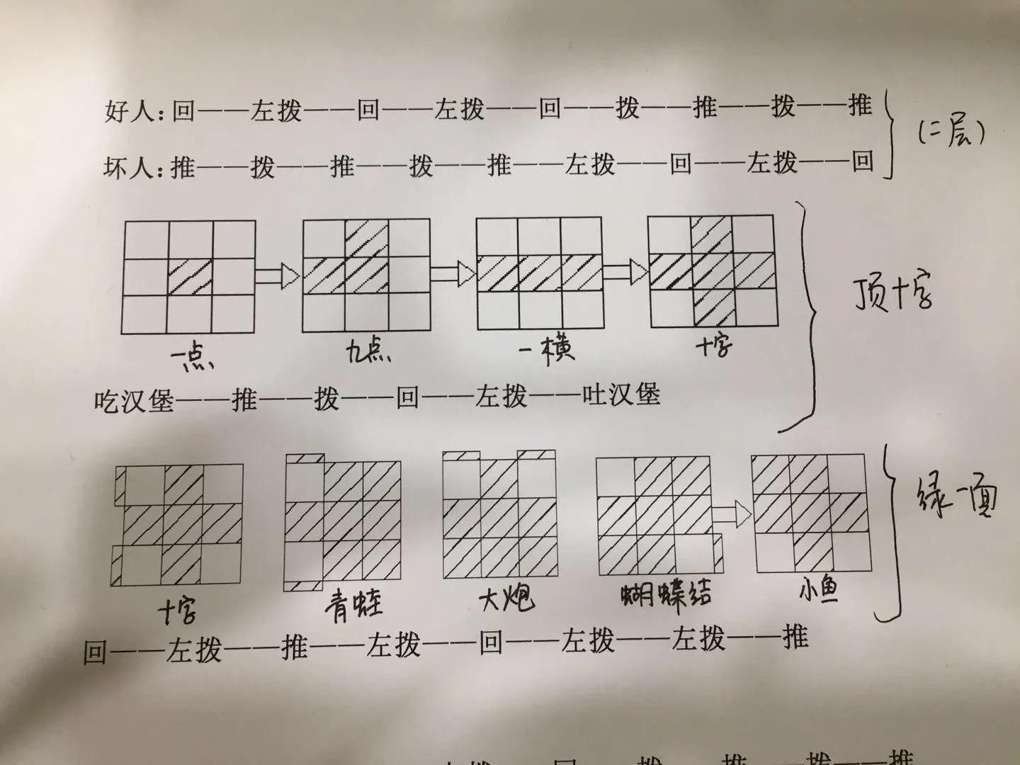 3.相同颜色面:青蛙(旋转青蛙的尾巴)、大炮(炮口面是F,左右手均可操作)、双菱(与中心块颜色相同角块侧面对自己,在右上角用左手,否则用右手)、十字(无上面颜色的一面对自己,左、右手操作)、小鱼型(鱼头对着自己,鱼尾的角块侧面颜色与上面中心块颜色相同对着哪个手心用哪个手操作)——上钩下钩上钩钩下(左手——L'U'LU'LU'U'L或右手——RUR'URUUR')