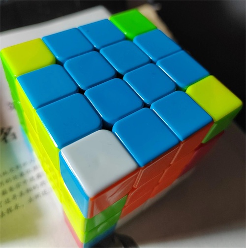 2.对面两个楞块组与邻面中心块颜色相同,另一组对面互换——(“十”字面向上,将另一组与中心块颜色不相同的面向自己,既F面),用:上2左2上2左2(MR2U2MR2U2)(MR:中间两层)