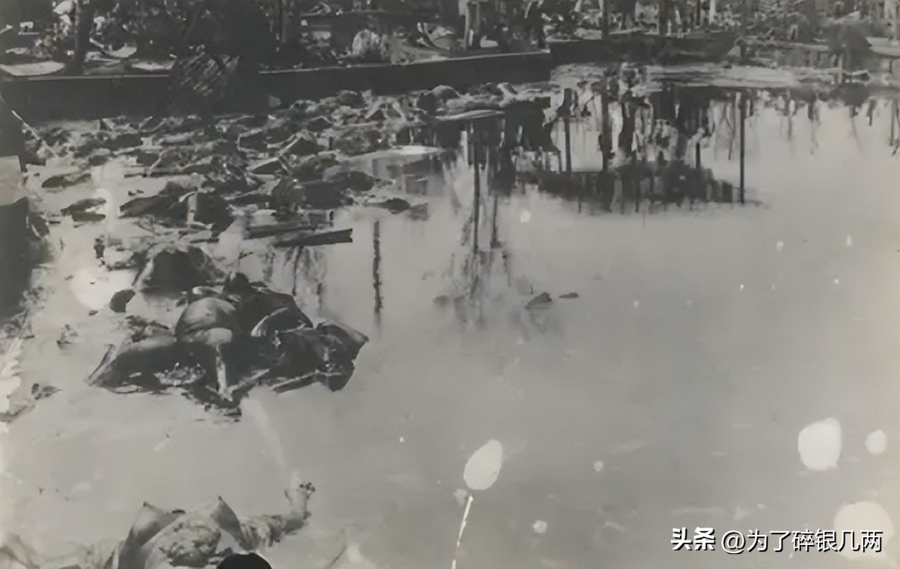 城市里面的一个池塘一角,里面漂浮着不少尸体,由于经过高温烧灼,加上当时天气炎热,这些尸体已经开始出现了腐烂,不少尸体都发出臭味,但是根本就来不及处理。
