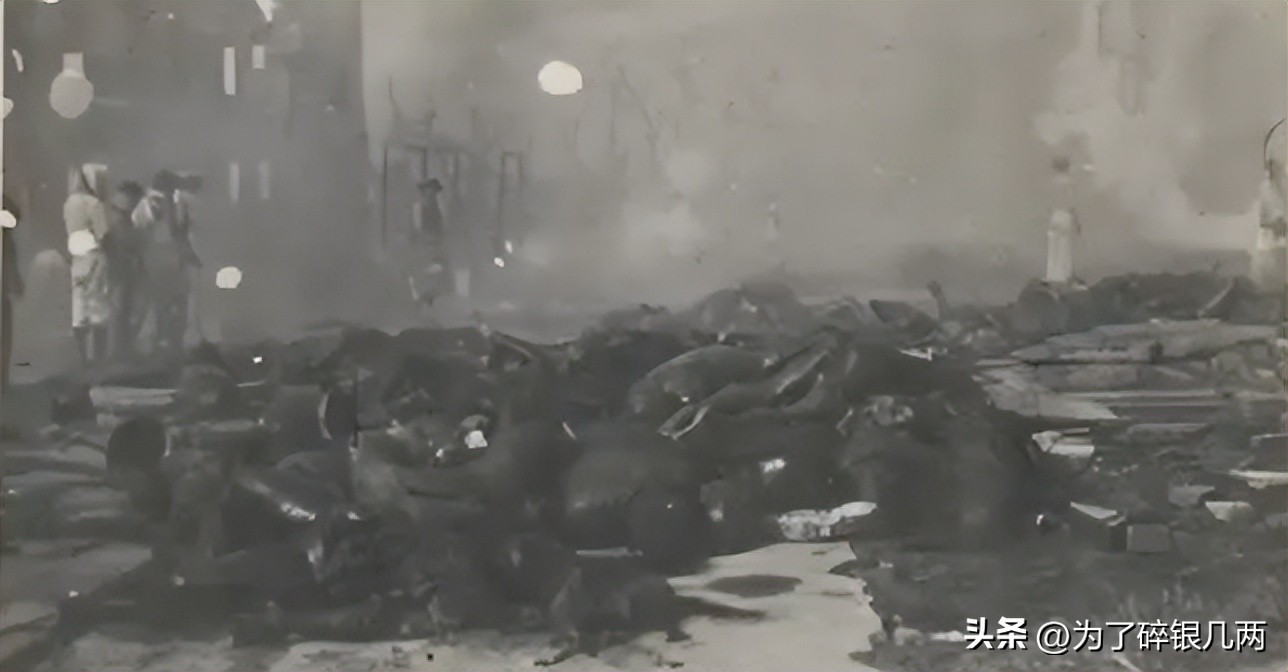 街头被烧成焦炭的尸体堆在一起,由于当时爆炸很突然,不少人根本来不及躲避,爆炸以后,直接被炸死,然后经过火焰的焚烧,直接变成焦尸,根本无法辨认,很多人一家全部都是被炸死烧死。