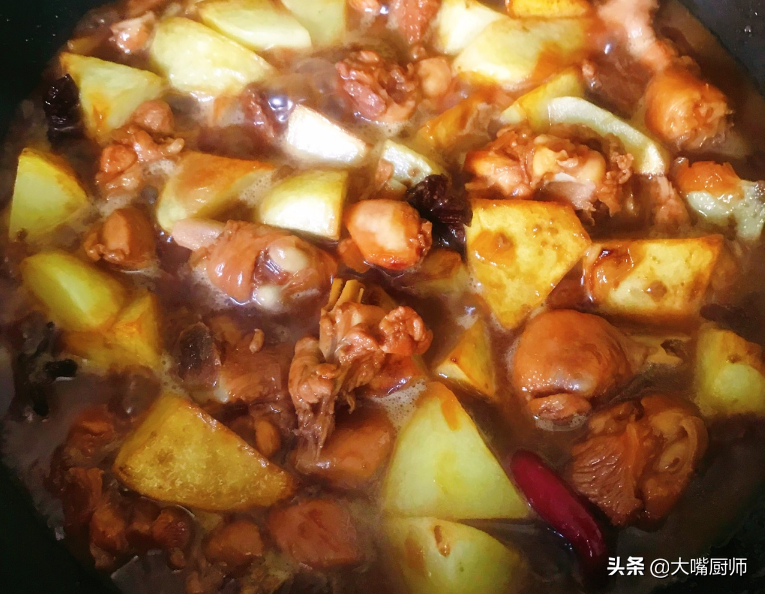 5、淋入料酒翻炒去腥,加入适量老抽上色,倒入土豆块,和鸡肉一起炒一会儿,倒入适量开水,大火煮开,用勺子撇掉出来的浮沫,盖上盖子,用小火继续炖20分钟。