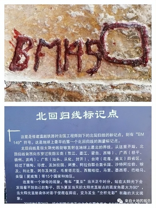 碧色寨是这条米轨铁路上的特等站。站房门前,法国工程师尼弗里士用法文刻下的世界上第一个北回归线测量标志点至今还清清楚楚,告诉人们这儿是地球上北温带与热带的分界线。