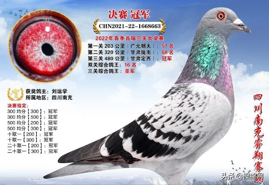 四川南充睿翔赛鸽公棚第三关决赛于5月16日开笼,1850羽赛鸽冲击最终的冠军宝座。本地鸽友刘运学的一羽雨点鸽强势夺冠,足环号2021-22-1668663,分速1499.45米/分,空距479.685公里。这羽赛鸽还凭借三关57名、68名、1名的稳定发挥,夺得三关鸽王亚军。