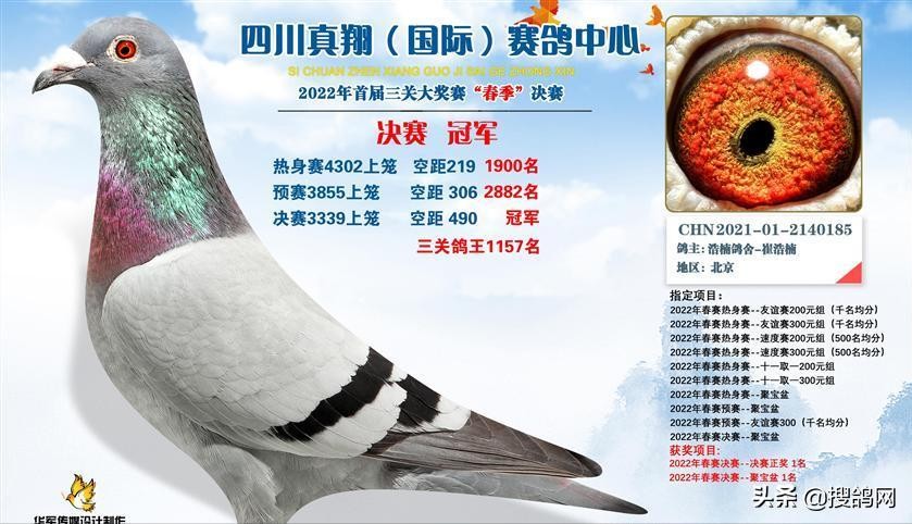 四川真翔(国际)赛鸽中心首届春赛已落幕,虽是首届,但表现不俗,三关打完,再打加战赛、第五关精英赛,可谓血战到底。在决赛中,北京鸽友浩楠鸽舍-崔浩楠强势登顶,斩获3339羽冠军,这羽赛鸽环号2021012140185,前两关均在千名之外,决赛逆袭夺冠,分速1265.3436米/分。