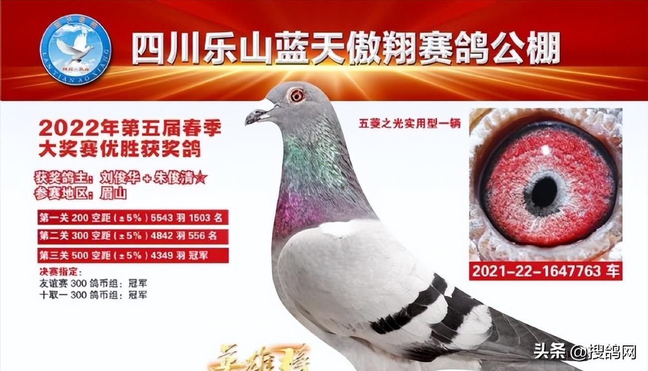 10余站训放、三关正赛、520公里加战赛,四川乐山蓝天傲翔赛鸽公棚第五届春赛一飞到底。在决战中,4349羽出征,刘俊华+朱俊清的一羽2021-22-1647763灰鸽抢先报进,领先亚军1分20秒,分速1332米/分,这羽赛鸽从首关1500名开外,到二关500名,再到决赛冠军,可以说状态一关比一关好,最终还赢得五菱之光汽车一辆。