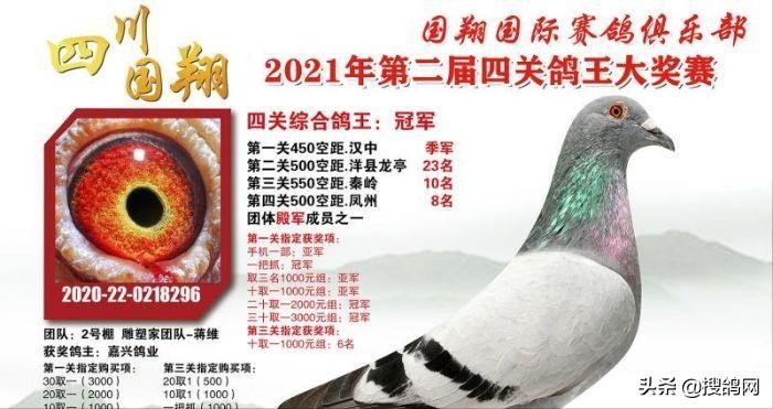 四川国翔赛鸽俱乐部第二届春赛,名家争霸,高手云集。在经过450公里、500公里、550公里、500公里四关大战之后,2号棚的一羽2020220218296拿下四关鸽王冠军,鸽主嘉兴鸽业,这羽赛鸽四关发挥稳定,关关入围前30名,分别拿下季军、23名、10名、8名,同时也是团体殿军成员之一,揽获超多指定大奖。此外,在鸽王前十名中,2号棚(棚雕塑家团队-蒋维)前十进五,获得本届大赛的金牌教练。搜鸽网为鸽友们带来养鸽赛鸽小常识以及鸽界趣事,关注搜鸽网微信公众号,下载搜鸽网APP(各大应用市场可以搜索到),为您带来实用养鸽小文章,大家共同探讨,共同进步,共同学习,如有问题更可留言,有问必答。