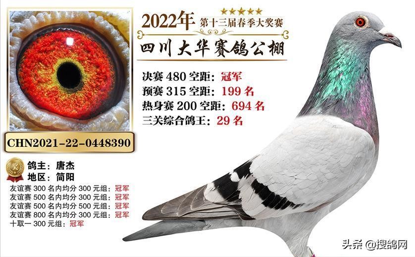 作为一家成功举办13届春赛的老牌公棚,四川大华赛鸽公棚今年的春赛同样精彩。在历经200公里热身赛、315公里预赛、480公里决赛过后,四川简阳的唐杰突出重围,其一羽2021-22-0448390赛鸽,夺下决赛冠军,获得5项指定冠军,同时还凭借稳定发挥,位列三关综合鸽王29名,最终以五万元成交。