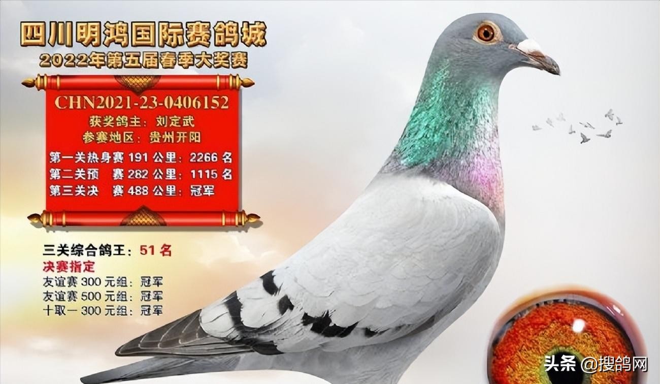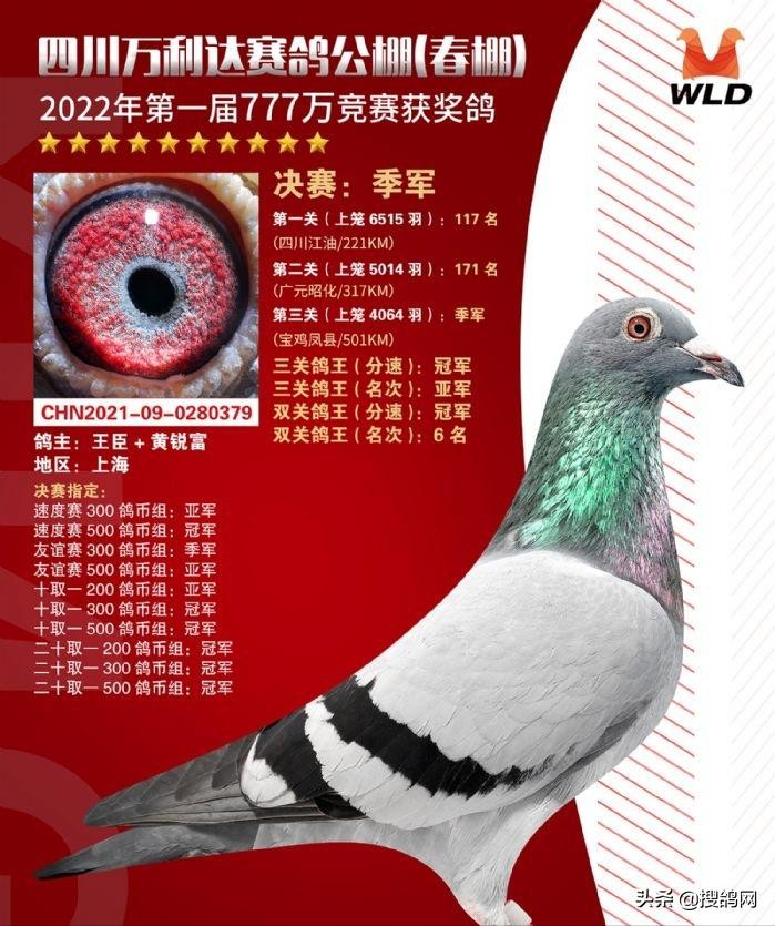 四川万利达春棚首届赛事伴随着221公里、317公里、501公里的三关赛落幕,四川崇州鸽友叶刚的一羽2021-22-0747379赛鸽越飞越快,拿下冠军,这羽赛鸽从三千多名,到一千多名,最后逆袭夺冠。而决赛季军得主也令人印象深刻,是来自上海名家王臣+黄锐富选送的一羽2021-09-0280379赛鸽,这羽赛鸽三关分别拿下117名、171名、季军,最终稳夺双关鸽王名次6名、双关鸽王分速冠军、三关鸽王名次亚军、三关鸽王分速冠军,尽显名家实力。看来厉害的名家到哪儿都能飞!