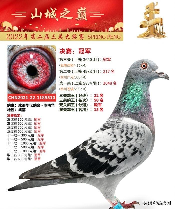重庆龙乡信鸽公棚(春棚)第二届春赛冠军得主,为鸽友成都华艺鸽舍-陈明华,他的一羽2021-22-1185510赛鸽,从200公里第一关1048名,二关300公里挺进217名,470公里决赛抢占第一。同时也是双关名次鸽王15名、分速鸽王殿军;三关名次鸽王50名、分速鸽王22名,斩获超十项指定大奖。
