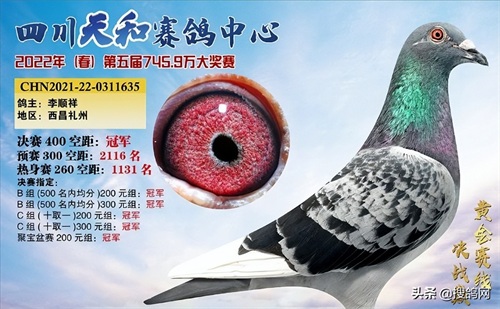 黄金赛线,决战巅峰!四川省西昌市天和赛鸽中心在经过14站路训后,先后开启三关赛,400公里决赛司放云南峨山,2399羽上笼,李顺祥的一羽21-22-0311635雨白条登顶夺冠,分速1389.7548米/分。