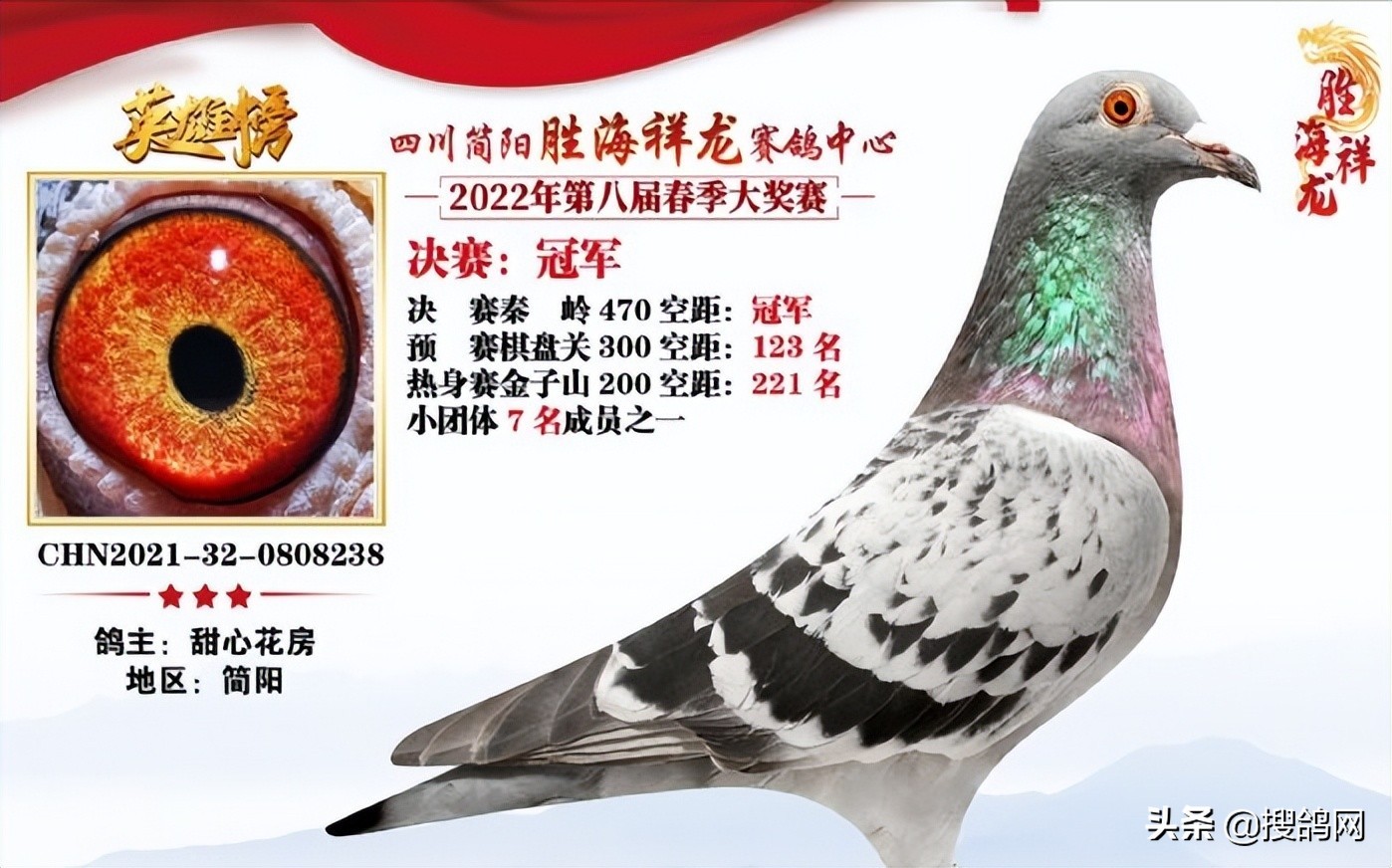 四川简阳胜海祥龙赛鸽中心第八届春赛,首关金子山、二关棋盘关、三关秦岭太白山,关关难。最终仅有450羽赛鸽入围决赛厮杀,在480公里决赛中,难度升级,当天112羽赛鸽坚强归巢。其中甜心花房的一羽2021320808238雨点鸽夺得冠军,分速1062.6235米/分。这羽赛鸽在如此高难度的赛事中,越飞越快,从221名到123名,再到冠军,力证实力。