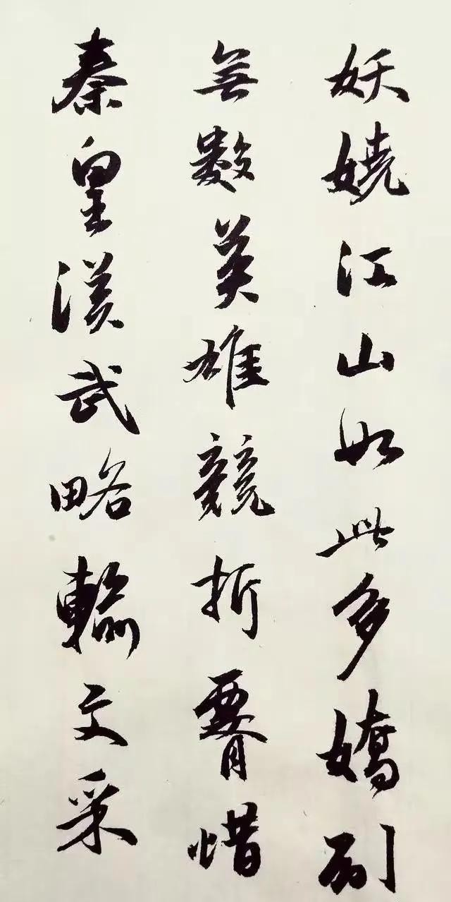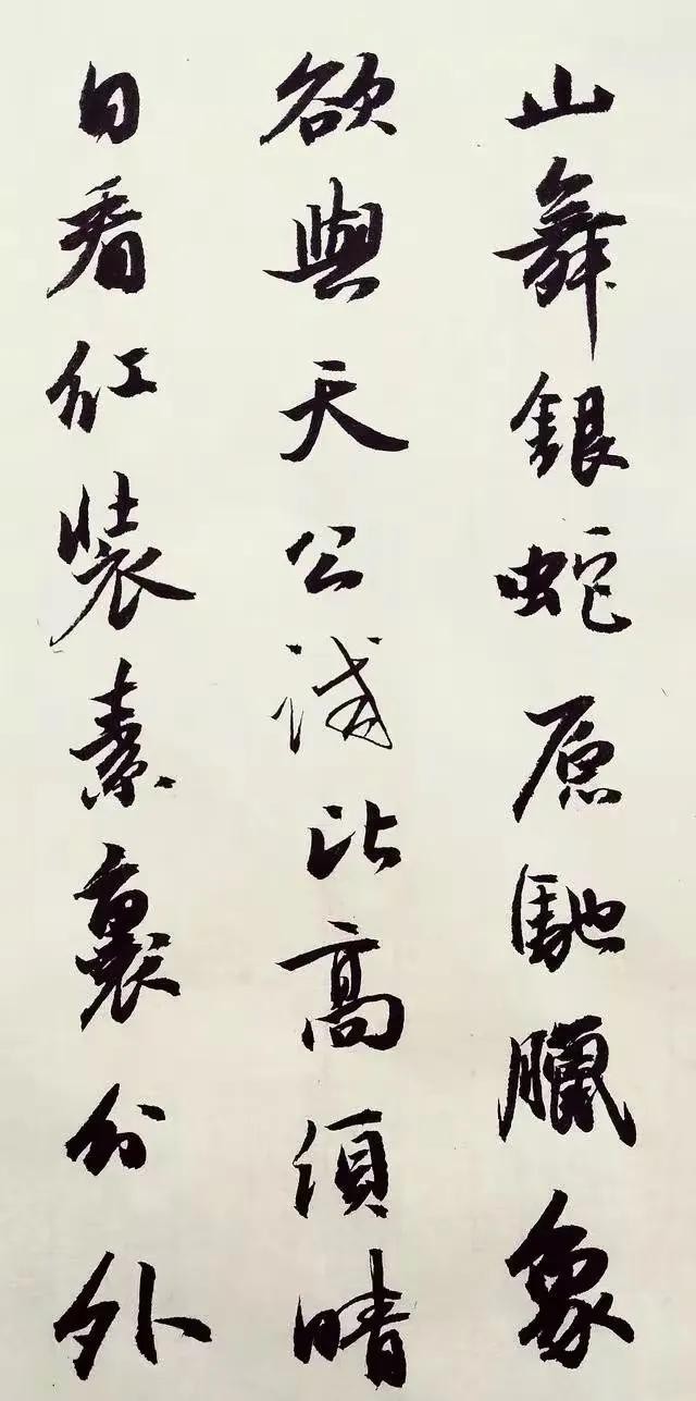 在结构上,遵循传统书法的结字规律,又不失个人风格的灵动。字的重心平稳,比例协调,疏密得当。如“山舞银蛇”四字,“山”字虽笔画简单,却通过笔画的粗细变化和空间的合理分布,显得稳重而大气;“舞”字笔画繁多,却能安排得错落有致,线条的交织犹如舞者灵动的身姿,充满了韵律感。