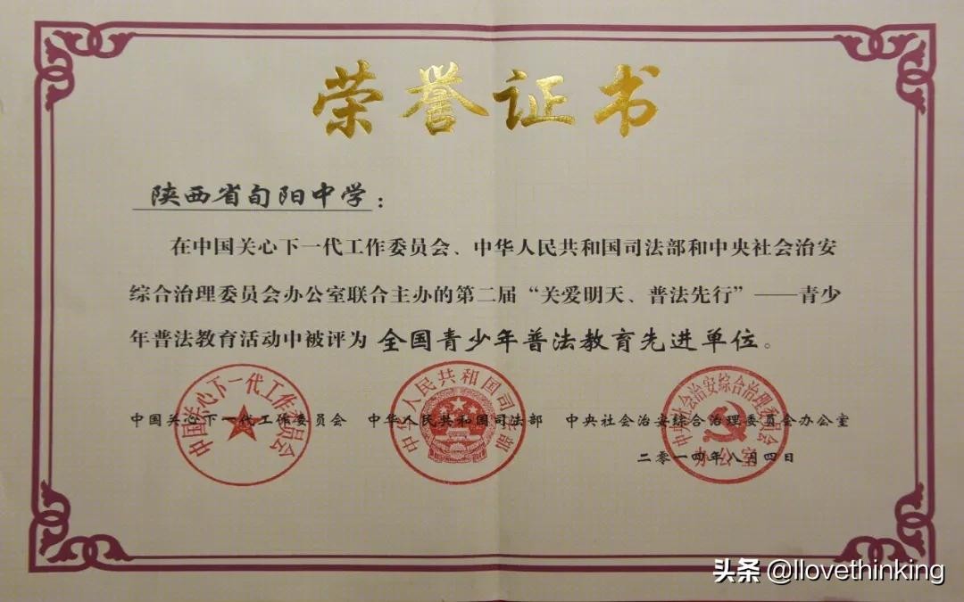 八年来,旬阳中学被中、省、市、县授予各类荣誉40余项,先后被国家关工委、司法部、综治委授予“全国青少年普法教育先进单位”,被公安部授予“全国消防安全教育示范校”,被省教育厅授予“陕西省文明校园”“陕西省校本研修实验学校”“陕西省后勤管理先进单位”“陕西省卫生工作先进单位”,被省住建厅授予“园林式单位”荣誉称号。2021年被陕西省教育厅、陕西省人民政府教育督导委员会办公室授予“陕西省教育督导评估316工程素质教育暨质量提升优秀学校”称号。
