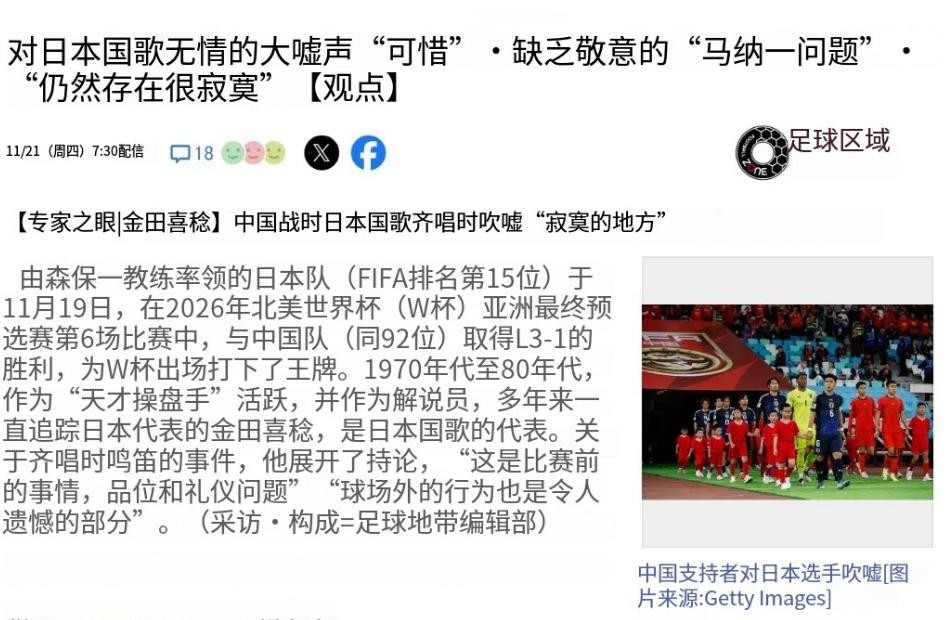 因为出现了国足观众集体唏嘘他们国家歌曲的情况。
