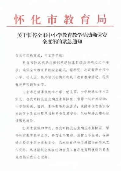 记者注意到,6月30日,怀化市教育局发出紧急通知,为了确保全市教育系统安全度过汛期,根据市防汛抗旱指挥部启动的防汛Ⅱ级应急响应工作要求,全市范围内的中小学、幼儿园以及校外培训机构的所有线下教学活动将暂时停止。