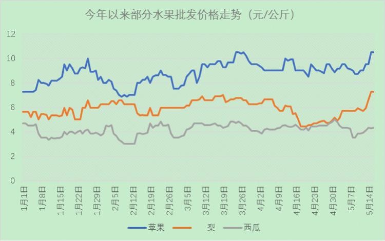 根据广州市发改委的数据监测显示,今年以来,广州市苹果、梨、西瓜等部分水果批发价格有波动上升。以苹果为例,1月初苹果批发价格约为7.25元/公斤,春节前升至10元/公斤,春节期间最低降至6.56元/公斤;其后频繁波动上升,3月下旬最高升至10.5元/公斤;4月初至5月上旬在8.5-9.9元/公斤之间波动,5月中旬重启升势,至5月16日重回10.5元/公斤的相对高位,比年初价格上升44.83%。