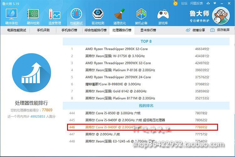 英特尔九代酷睿I5 9400F鲁大师得分77869