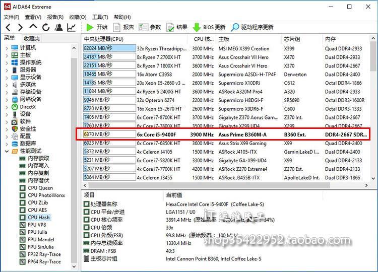酷睿I5 9400F Aida64 CPU Hash 测试排行榜