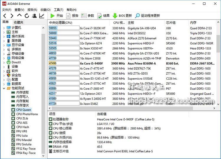 酷睿I5 9400F Aida64 CPU Queen测试排行榜
