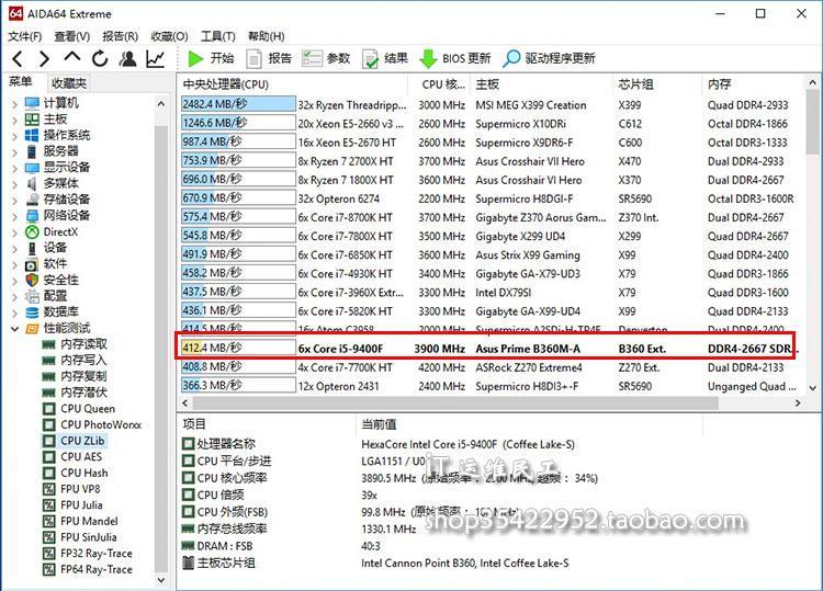 酷睿I5 9400F Aida64 CPU Zlib测试排行榜